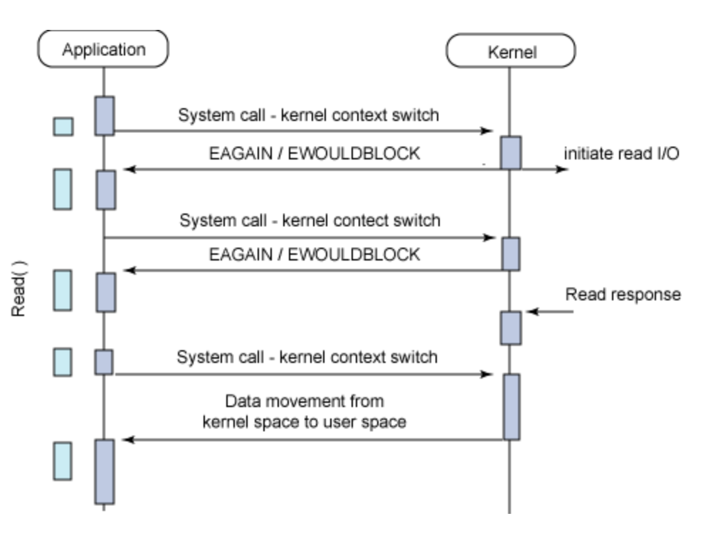 ์ด ๊ฒฝ์ฐ I/O์ ์งํ์๊ฐ๊ณผ ๊ด๊ณ๊ฐ ์๊ธฐ ๋๋ฌธ์ (๋๊ธฐํ์ง ์์์) application์์ ์์ ์ ์ค๋ ์๊ฐ ์ค์งํ์ง ์๊ณ I/O์์ ์ ์งํํ ์ ์๋ค. ๊ทธ๋ฌ๋ ๋ฐ๋ณต์ ์ผ๋ก ์์คํ ํธ์ถ์ด ๋ฐ์ํ๊ธฐ ๋๋ฌธ์ ์ด ๊ฒฝ์ฐ ์ญ์ ์์์ด ๋ญ๋น๋๋ค.