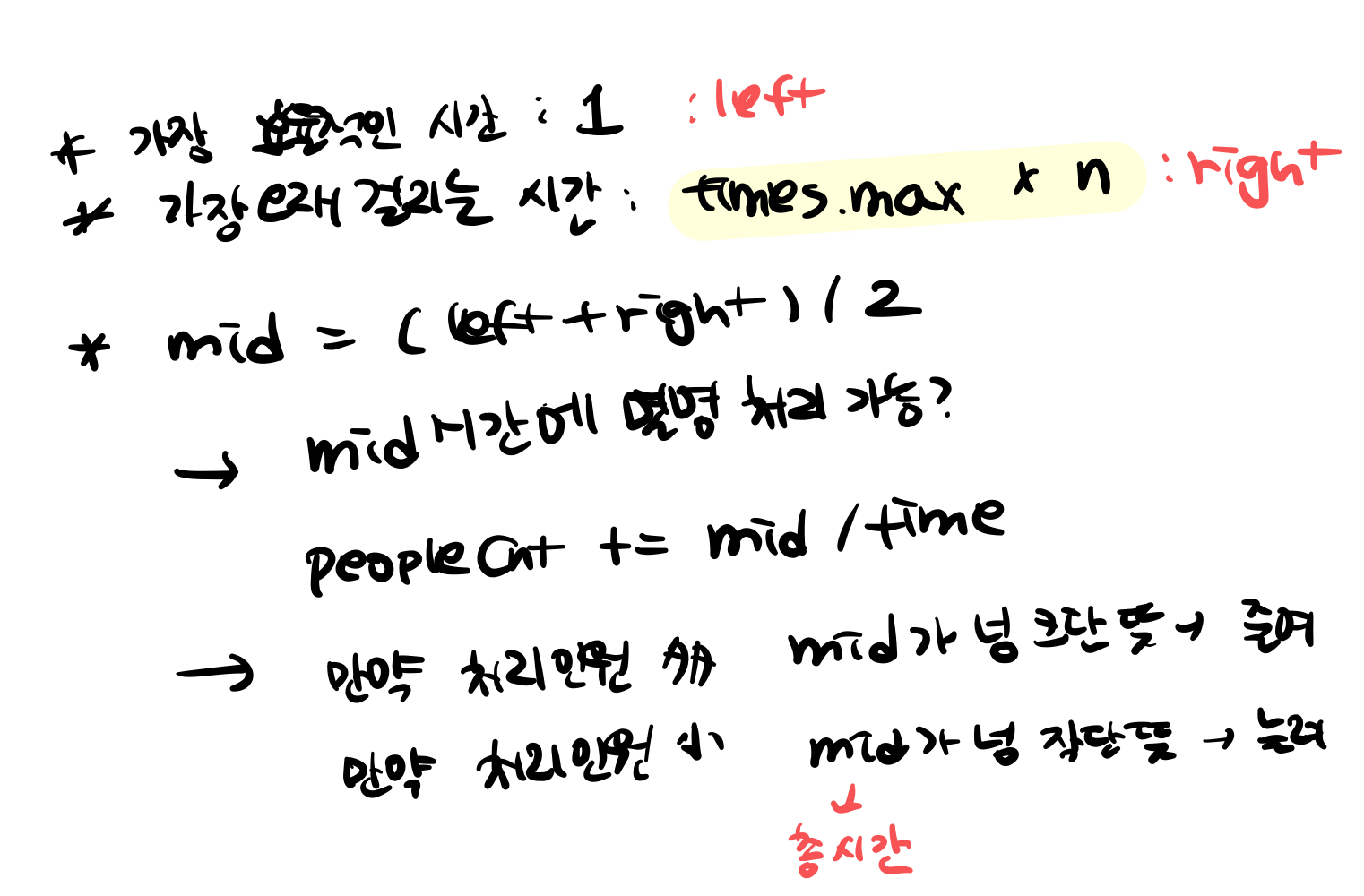 ๊ณต์ ๊ธฐ์ค์น ๋ฌธ์ ์์ '๊ฑฐ๋ฆฌ'๋ฅผ ๊ธฐ์ค์ผ๋ก left, right, mid๋ฅผ ์ค์ ํ์๋ค. ์๋ ์ด๋ถํ์์ ๊ฐ์ฅ ๊ธฐ๋ณธ์ ์ธ ํํ๋ก๋ idx๋ฅผ ๊ธฐ์ค์ผ๋ก ํ๋์ฉ ํ์ํ๋ ๋๋์ด์๋๋ฐ ์ด๋ ๊ฒ '๊ฑฐ๋ฆฌ'๋ '์๊ฐ'์ ๊ธฐ์ค์ผ๋ก left, right๋ฅผ ์ค์ ํด ์ฃผ์ด์ผํ๋ ๋ฌธ์ ๋ค์ด ๋ค์ ์ถ์ ๋๋๋ณด๋ค! ์ตํ๋์.